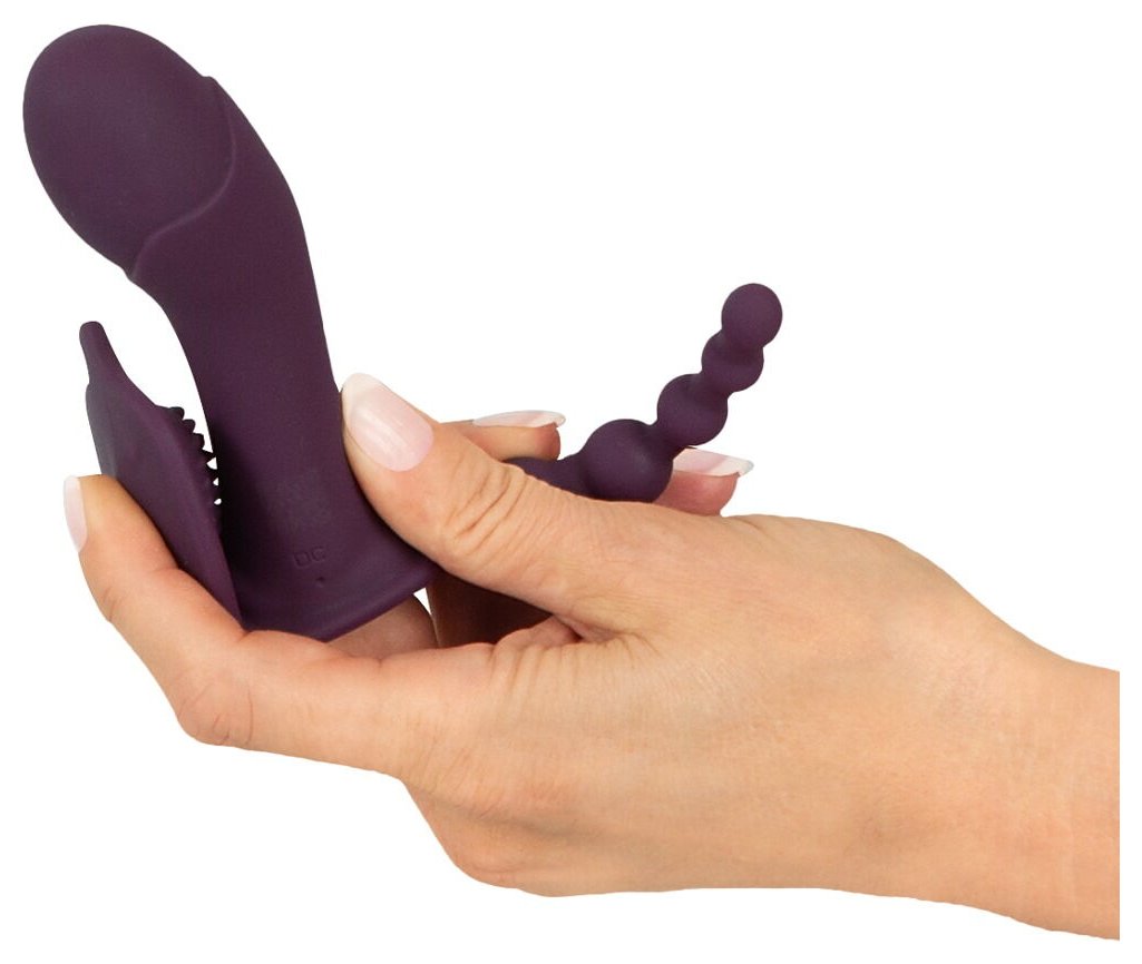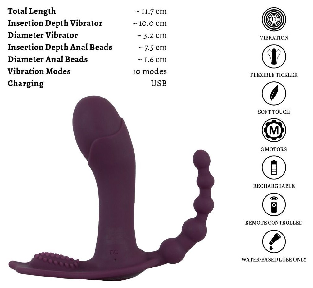 Интенсивный вибратор для трусиков ARIVA с помощью энергичных вибраций одновременно воздействует на вагину, клитор и промежность/анус. Тихий, незаметный и ненавязчивый, вы можете наслаждаться легким, шелковистым тройным вибратором в любое время и в любом месте в ваших трусиках. Три мощных моторчика распределяют вибрацию специально на все самые интимные зоны удовольствия. Всестороннее стимулирующее удовольствие, в котором ни одна точка не останется без внимания! Не менее 10 режимов вибрации предлагают множество вариантов незаметной тройной стимуляции и удобно управляются с помощью практичного пульта дистанционного управления. Благодаря радиусу действия в 10 метров им может управлять и ваш партнер. Идеально подходит для неожиданных игр вдвоем - дома и на отдыхе. Кроме того, вибрацией можно управлять прямо на игрушке одним нажатием кнопки. Изготовленный из тончайшего силикона шелковистый стержень с пухлой головкой легко вводится. Мягкая ворсистая подушечка ласкает клитор. Гибкий стимулятор в виде пули разного диаметра ублажает анальную зону. Вибратор в трусиках гибко подстраивается под тело и повторяет каждое движение. Это означает, что тройная вибрация всегда ощущается интенсивно - как внутри, так и снаружи. Тройное удовольствие, которое можно получить везде! Длина вагинального отростка - 10 см, диаметр - 3,2 см. Длина анального хвоста - 7,5 см, диаметр - 1,6 см.