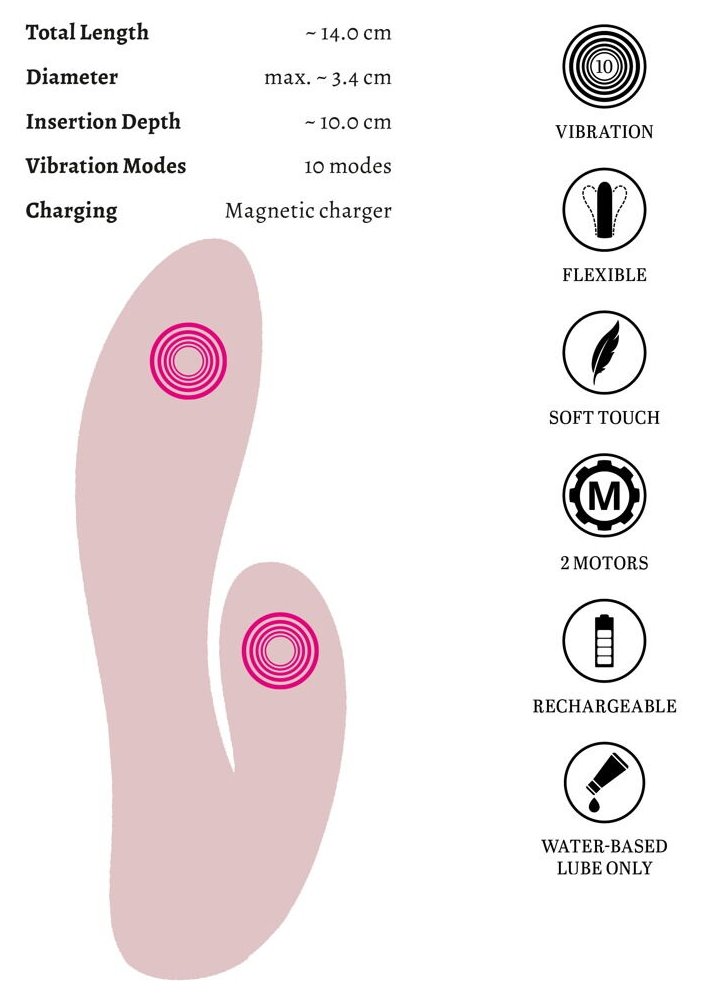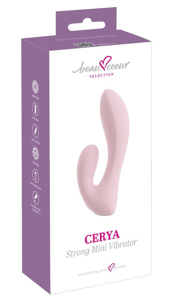 Чувственно изогнутый мини-вибратор CERYA с помощью двух отростков одновременно ласкает вагину и клитор. Его сверхмощные вибрации проникают очень глубоко, под кожу и прямо в точку. 10 различных режимов вибрации позволяют подобрать подходящую скорость для любого настроения и кульминации. Просто нажмите на кнопку. Маленький и удобный вибратор-кролик изготовлен из шелковисто-мягкого силикона. Он легко вставляется и отлично сидит. Он очень гибкий и гармонично сочетается с каждым движением. Вибрация всегда ощущается интенсивно как внутри, так и снаружи. Два тихих, но мощных моторчика обеспечивают надежное питание для этого двойного удовольствия. Перезаряжаемый - USB-кабель для зарядки входит в комплект. Рабочая длина - 10 см.