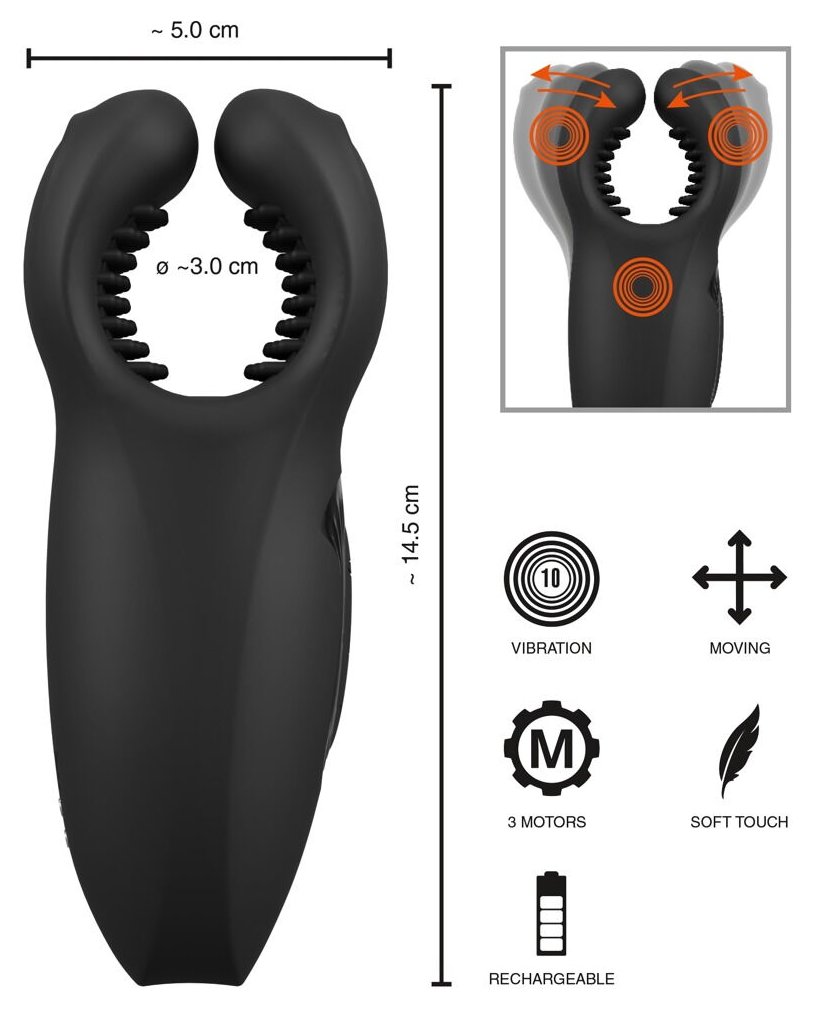Мастурбатор с массажными виброкрыльями. Комфортный хэндджоб для пениса или мошонки. Подвижные крылышки двигаются вперед-назад, 3 мощных, тихих моторчика, 10 режимов движения, 10 режимов вибрации. Простое управление. Шелковистый мягкий силикон. Перезаряжаемый - в комплекте USB-кабель. Ширина - 5 см.
