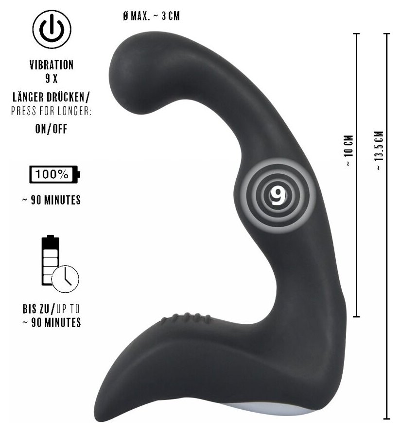 Гибкий вибратор простаты с изогнутой головкой и стимулятором промежности со стимулирующими канавками. 9 режимов вибрации. Перезаряжается с помощью входящего в комплект USB-разъема. Рабочая длина - 10,5 см.