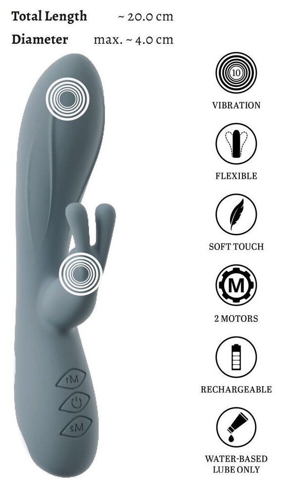 Гибкий вибратор-кролик. 2 отростка, по 10 режимов вибрации в каждом. Стимулирует вагину и клитор одновременно. 2 тихих моторчика, управляемых отдельно. Простое кнопочное управление. Мягкая рифленая структура. Мягкий шелковистый силикон. Перезаряжаемый - USB-кабель для зарядки в комплекте. Рабочая длина - 10,5 см.