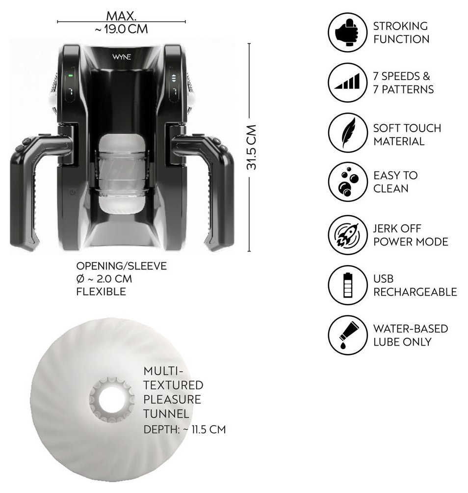 Мощный стимулятор WYNE Masturbator 10, который интенсивно массажирует пенис в движущейся вверх-вниз втулке-мастурбаторе. Практичные ручки по бокам обеспечивают максимальный комфорт и легкое управление. Полностью автоматический комфортный ручной массаж без усталости рук! Различные длины хода (5), режимы движения (7) и скорости (7) удобно устанавливаются одним нажатием кнопки. Чем короче выбранная длина хода, тем выше максимальная скорость движения рукава. Все функции оптимально контролируются благодаря светодиодным дисплеям. Очень мягкий, эластичный рукав нейтрального цвета оснащен бесчисленными мягкими структурами внутри, которые массируют пенис по всей длине. Открытую с обеих сторон насадку можно снять для легкой очистки, а также использовать самостоятельно для мануального хэндджоба. Перезаряжаемая - USB-кабель для зарядки входит в комплект.