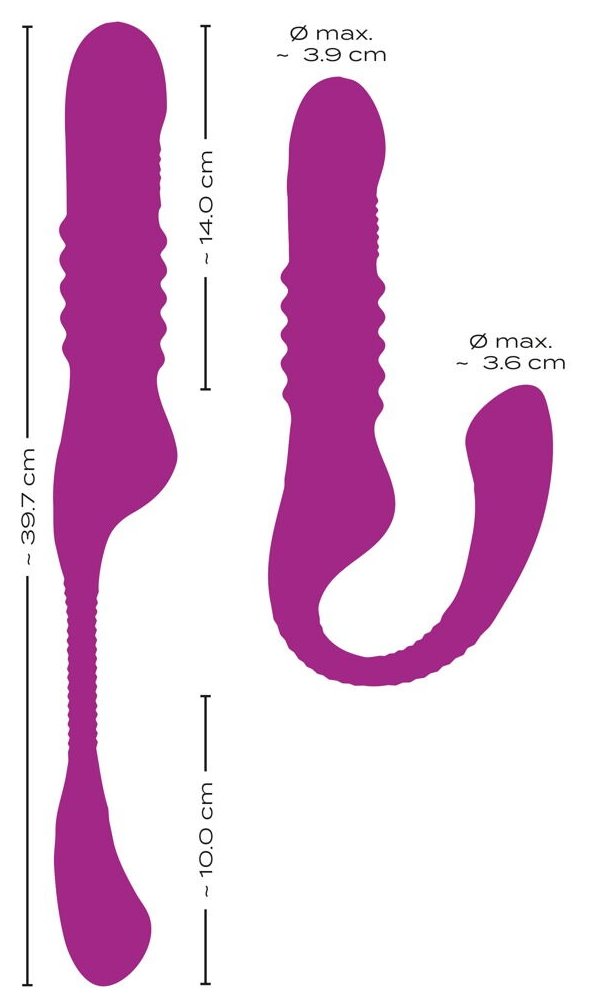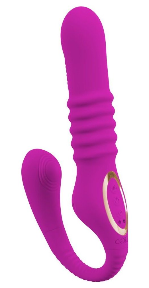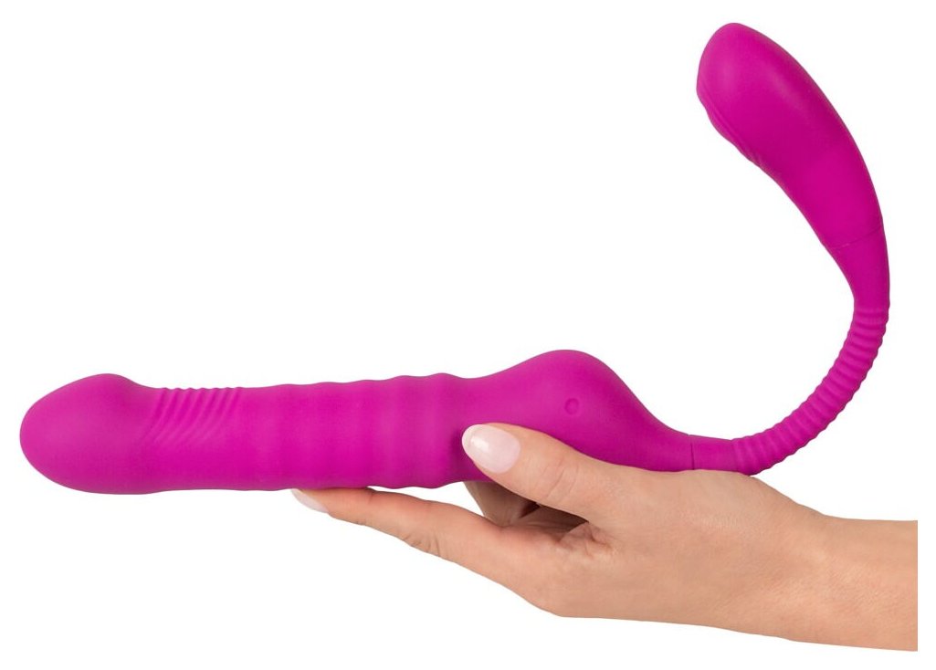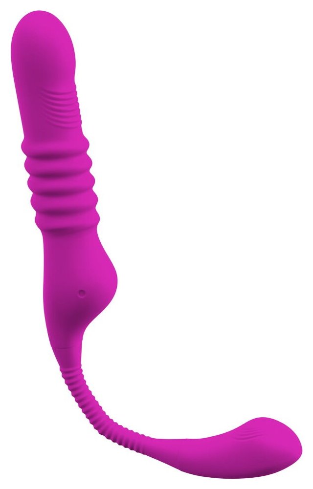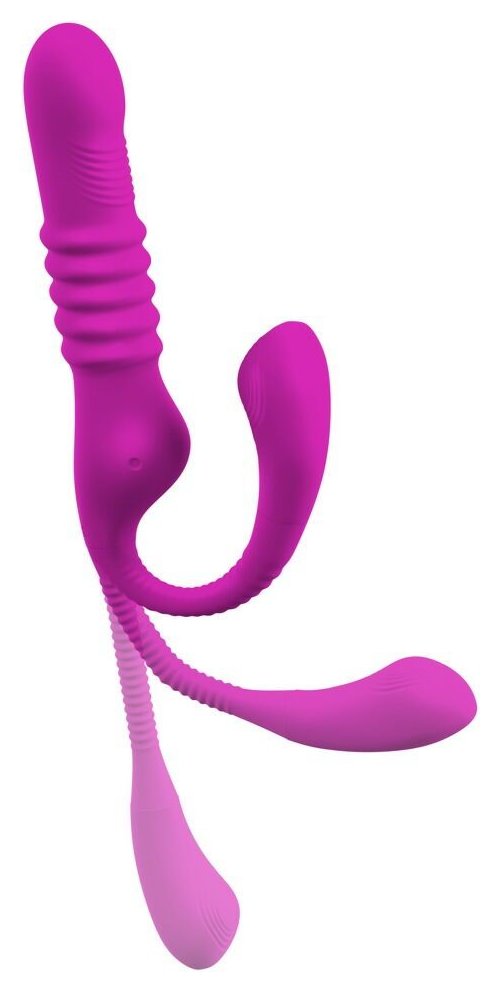 Вибратор с клиторальным стимулятором. 3 моторчика для вибрации, функции фрикций и постукивающих импульсов. Побалуйте вагину и клитор одновременно. 10 режимов вибрации, 3 скорости фрикций, 10 режимов постукивания в стимуляторе клитора. Функциями можно управлять отдельно. Податливый и гибкий. Силикон с шелковистой мягкой текстурой на ощупь. Водонепроницаемый. Перезаряжаемый - в комплекте USB-кабель для зарядки. Рабочая длина - 14 см.
