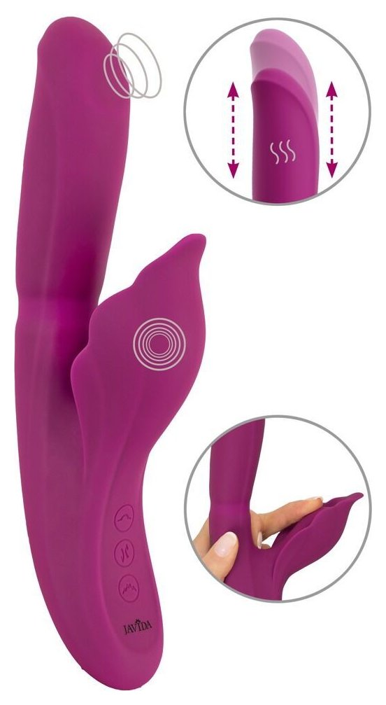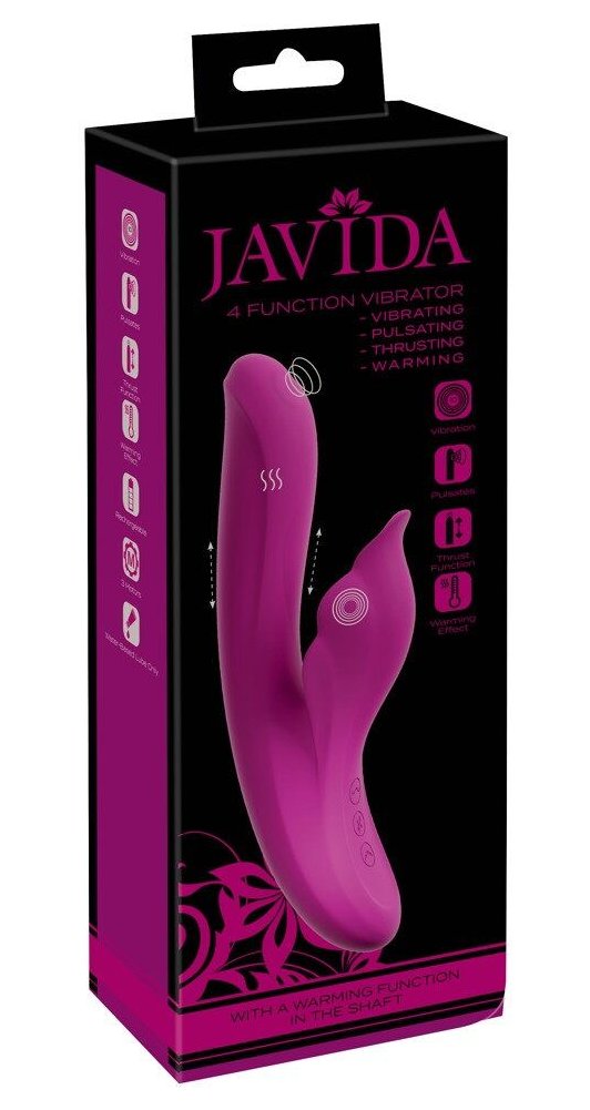 Вибратор-кролик с 4 функциями. Стимулирует внутри и снаружи одновременно. Фрикции, тепло и пульсирующие импульсы для вагины. 10 режимов вибрации для клитора. 3 тихих моторчика. 7 скоростей возвратно-поступательных движений, 5 режимов пульсации для G-зоны. С функцией нагрева. Простое управление одним нажатием кнопки. Функциями можно управлять отдельно. Шелковистый мягкий силикон. Перезаряжаемый - в комплекте USB-кабель для зарядки. Рабочая длина - 13,5 см.