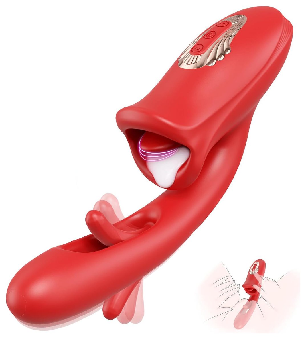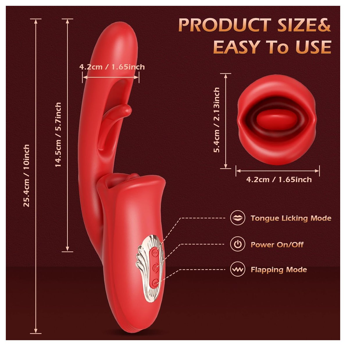 Вибратор выполнен из бархатистого силикона с декоративным пластиковым элементом. Вагинальная часть имеет 10 режимов вибрации, включается средней кнопкой коротким нажатием. Фингеринг осуществляется благодаря встроенному в вагинальную часть лепестка, также имеет 10 режимов и включается верхней кнопкой на панели управления. Клиторальная часть тоже имеет 10 режимов лизания, включается нижней кнопкой. Все три функции могут работать как по отдельности, так и одновременно, адаптируясь под желания пользователя. Вибратор изготовлен из силикона, водонепроницаем и перезаряжается от магнитной зарядки. Время зарядки — 120 минут, время работы — до 60 минут. Рабочая длина - 14,5 см.