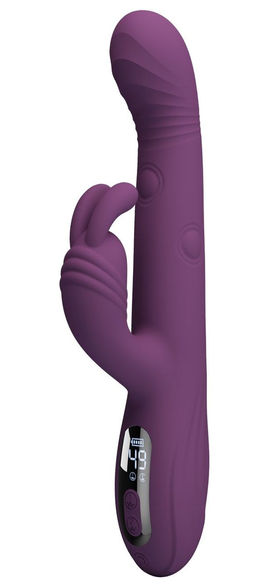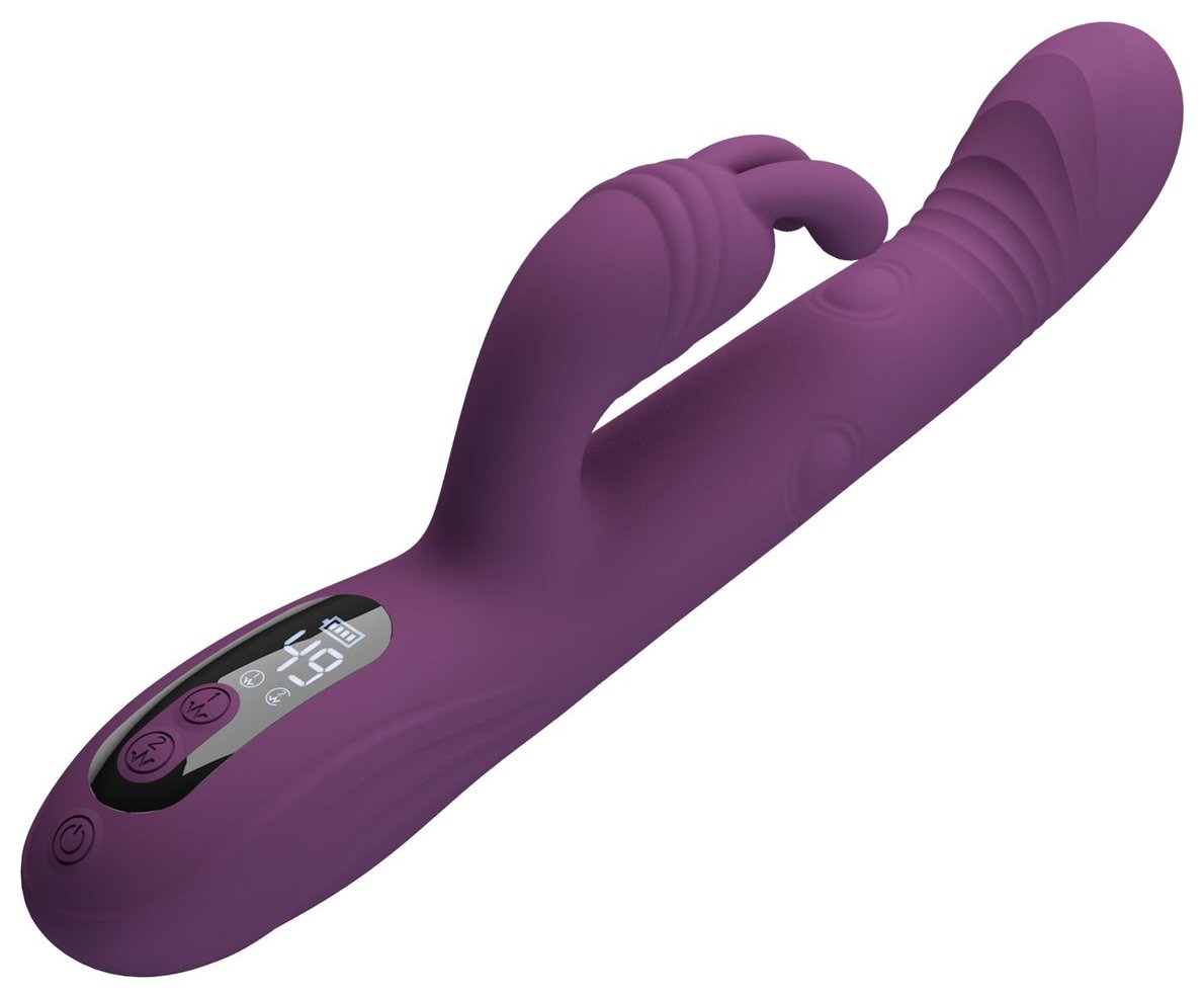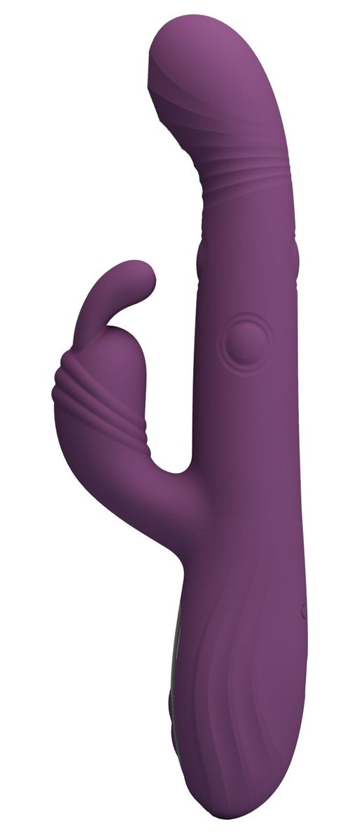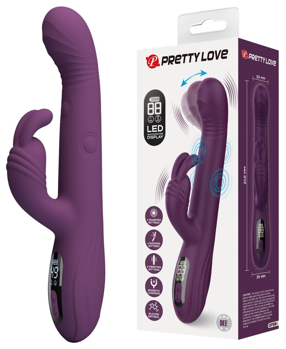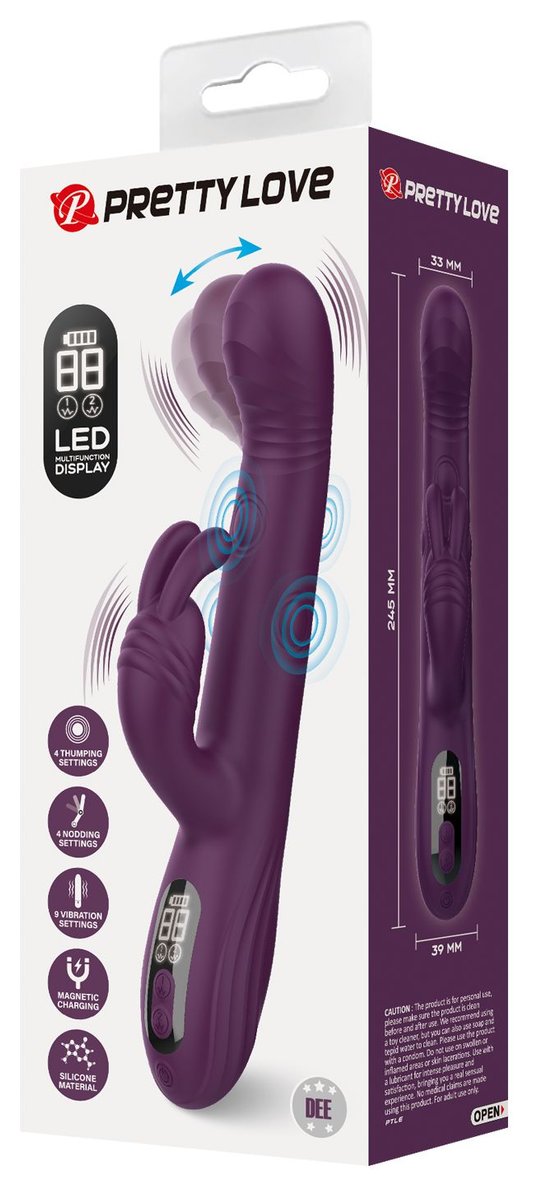 Фиолетовый вибромассажёр-кролик Dee. 9 режимов вибрации, 4 режима кивания, 4 режима постукивания. Рабочая длина - 14 см.
