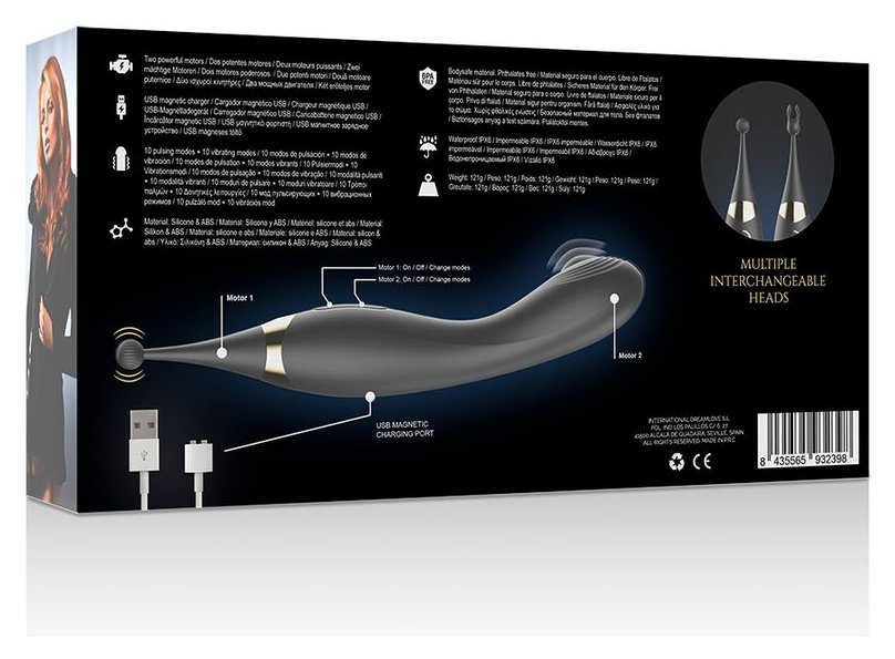 Уникальный вибратор для женщин, созданный для двойной стимуляции и максимального удовольствия. Эргономичная форма идеально направляет игрушку на точку G и клитор, обеспечивая интенсивную и точную стимуляцию благодаря встроенному мини-шарику с волнообразными движениями. Два мощных мотора позволяют работать одновременно или отдельно, предлагая 10 режимов пульсации и 10 режимов вибрации, которые можно комбинировать для создания до 20 вариантов ощущений. Рельефная структура и гладкая поверхность из гипоаллергенного силикона делают введение мягким и комфортным, а округлый наконечник точно воздействует на все эрогенные зоны: клитор, малые половые губы, соски или промежность. Вибратор полностью водостойкий (IPX6), что позволяет использовать его в душе или ванной, и оснащён встроенным аккумулятором с магнитной USB-зарядкой: полный цикл зарядки занимает около 120–130 минут, обеспечивая до 100 минут непрерывного удовольствия. Изготовлен из медицинского силикона. Диаметр вагинальной части - 3,5 см.