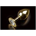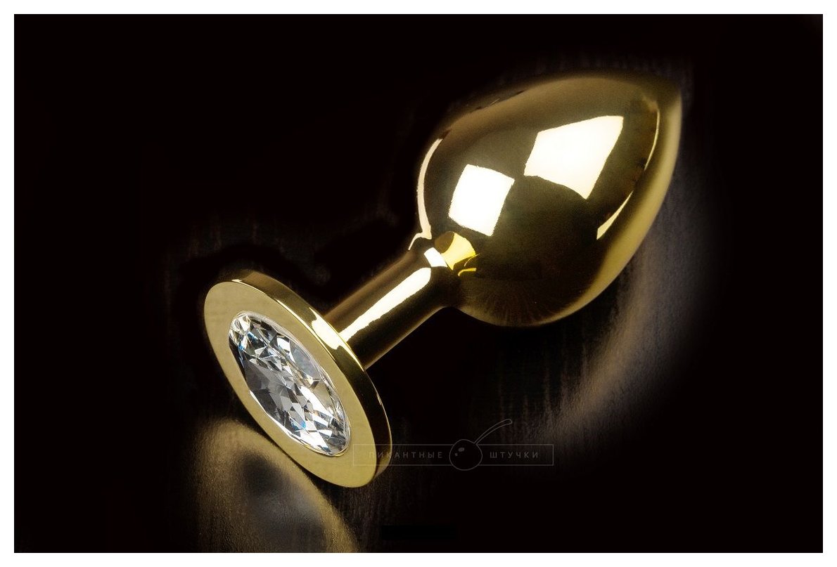 Большая золотая анальная пробка с закругленным кончиком и прозрачным кристаллом - 9 см