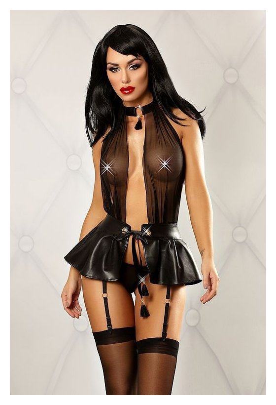 Очаровательное миниатюрное платьице под кожу с эффектом мокрого блеска с сочетанием прозрачного тюля. Воротник-ошейник украшен кольцом и кисточкой, застегивается на липучку. Вся фурнитура сделана под золото. Юбочка спереди завязывается кожаным шнурком, точно так же декорированным на концах кисточками, как и ошейник. Маленькие прозрачные трусики и пажи для чулок в комплекте. В комплекте: платье, трусики-стринги. Внимание: размеры не соответствуют международным! Обратите внимание на размерную сетку производителя!