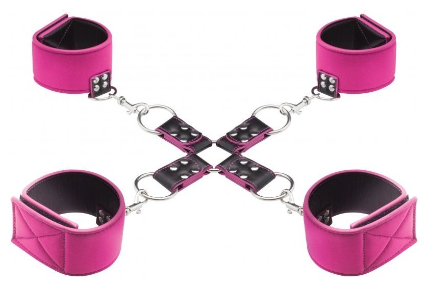 Манжеты этого фиксатора имеют полиуретановую и неопреновую стороны, это позволяет выбирать касающийся вашей кожи материал простым выворачиванием манжет на другую сторону. Неопреновая сторона цветная, а полиуретановая — чёрная, для придания грубости её внешнему виду! Они также снабжены застёжками-липучками, то есть они подойдут практически каждому. Система с карабинами для обеспечения взаимозаменяемости с другими бондажными игрушками.