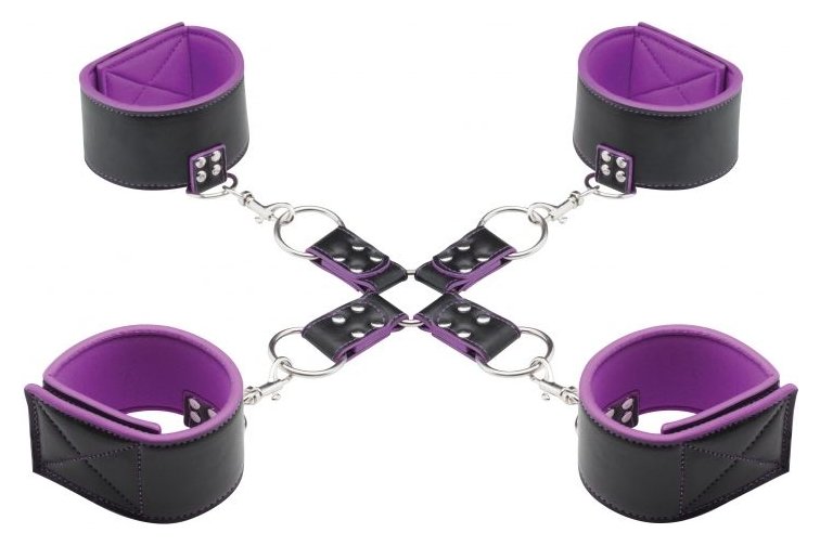 Манжеты этого фиксатора имеют полиуретановую и неопреновую стороны, это позволяет выбирать касающийся вашей кожи материал простым выворачиванием манжет на другую сторону. Неопреновая сторона цветная, а полиуретановая — чёрная, для придания грубости её внешнему виду! Они также снабжены застёжками-липучками, то есть они подойдут практически каждому. Система с карабинами для обеспечения взаимозаменяемости с другими бондажными игрушками.