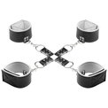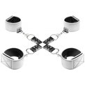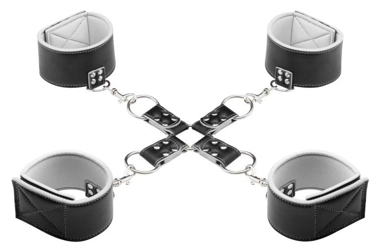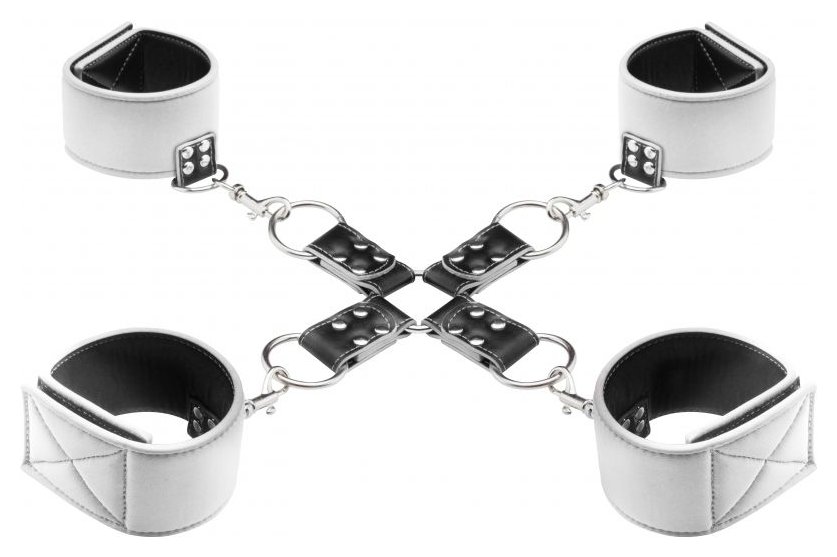 Манжеты этого фиксатора имеют полиуретановую и неопреновую стороны, это позволяет выбирать касающийся вашей кожи материал простым выворачиванием манжет на другую сторону. Неопреновая сторона цветная, а полиуретановая — чёрная, для придания грубости её внешнему виду! Они также снабжены застёжками-липучками, то есть они подойдут практически каждому. Система с карабинами для обеспечения взаимозаменяемости с другими бондажными игрушками.