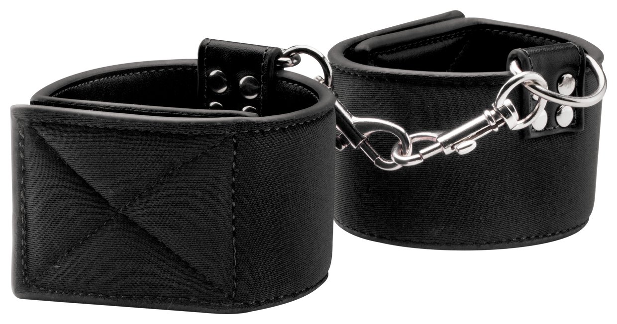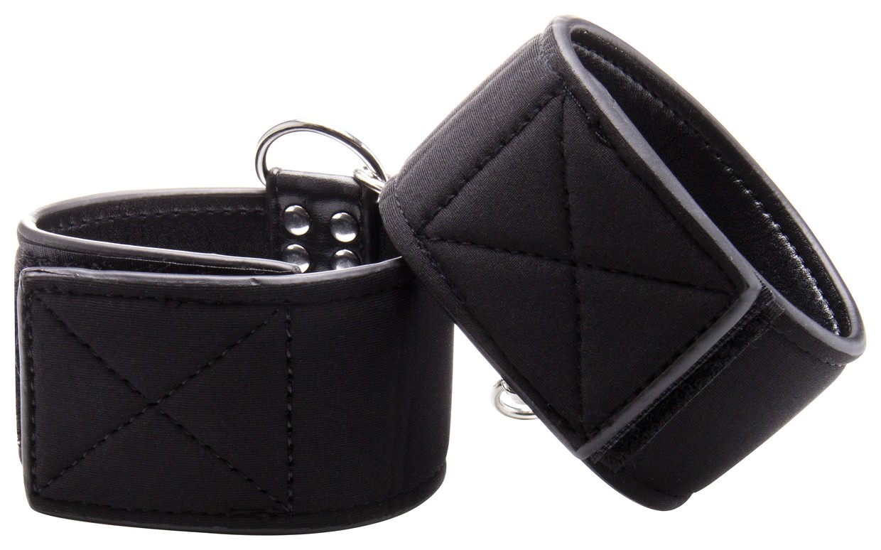 Одна из с торон этих оков полиуретановая, а другая — неопреновая, и это позволяет выбирать касающийся вашей кожи материал простым выворачиванием манжет на другую сторону. Неопреновая сторона цветная, а полиуретановая — чёрная, для придания грубости её внешнему виду! Они также снабжены застёжками-липучками, благодаря чему подойдут практически каждому.