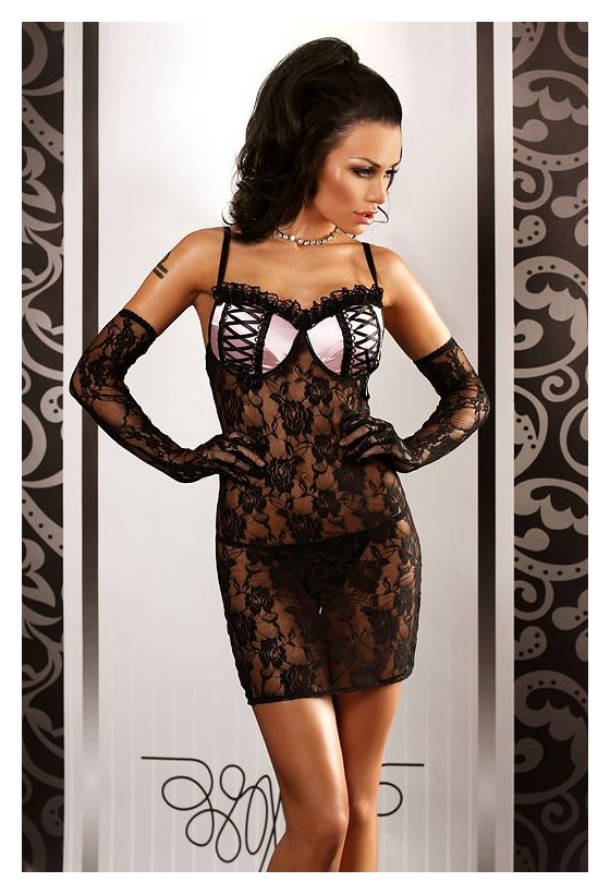 Кружевная сорочка Lover с сатиновым розовым лифом. Крупный цветочный узор, манящая полупрозрачность. Перчатки и трусики не входят в комплект!