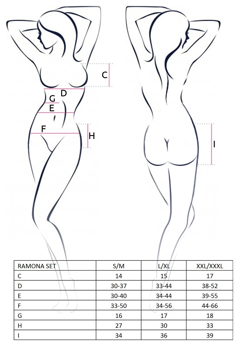 Гламурная дива, богемная нимфа, прекрасный ангел –образы, в которых вы легко предстанете в эротическом комплекте Ramona. Прозрачный лиф из тонкой сеточки отлично держит грудь, при этот ничего не скрывая, а, наоборот, превознося ее прелесть. Лиф дополнен широкой резинкой под грудью, которая невероятно комфортно ложится на тело. Высокий пояс с пажами для чулок декорирован широкой рюшей, что позволяет Вам скрыть все недостатки фигуры, выгодно подчеркнув достоинства. Трусики-стринги дополняют комплект. В комплекте: лиф, пояс с пажами и трусики-стринги.