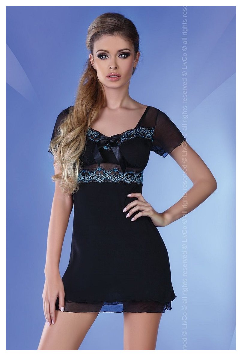 Сорочка и трусики из стрейч-атласного материала. Сорочка украшена вышивкой и атласным бантом в зоне декольте. В комплекте: сорочка, трусики-стринги.