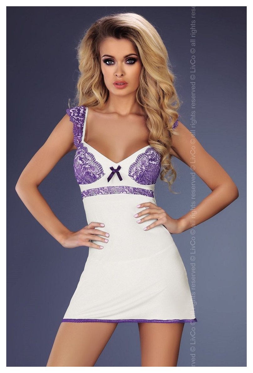 Белая сорочка из стрейч-атласного материала, зона декольте и бретели украшены кружевом. В комплект входят трусики. В комплекте: сорочка, трусики-стринги.