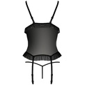 Корсет из кружева и полупрозрачного материала. Спереди корсет на шнуровке, пажи для чулок регулируются по длине. В комплект входят трусики. В комплекте: корсаж, трусики-стринги.