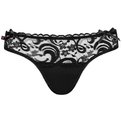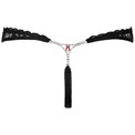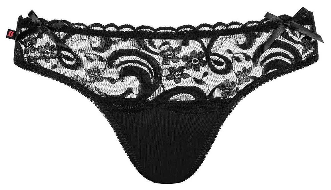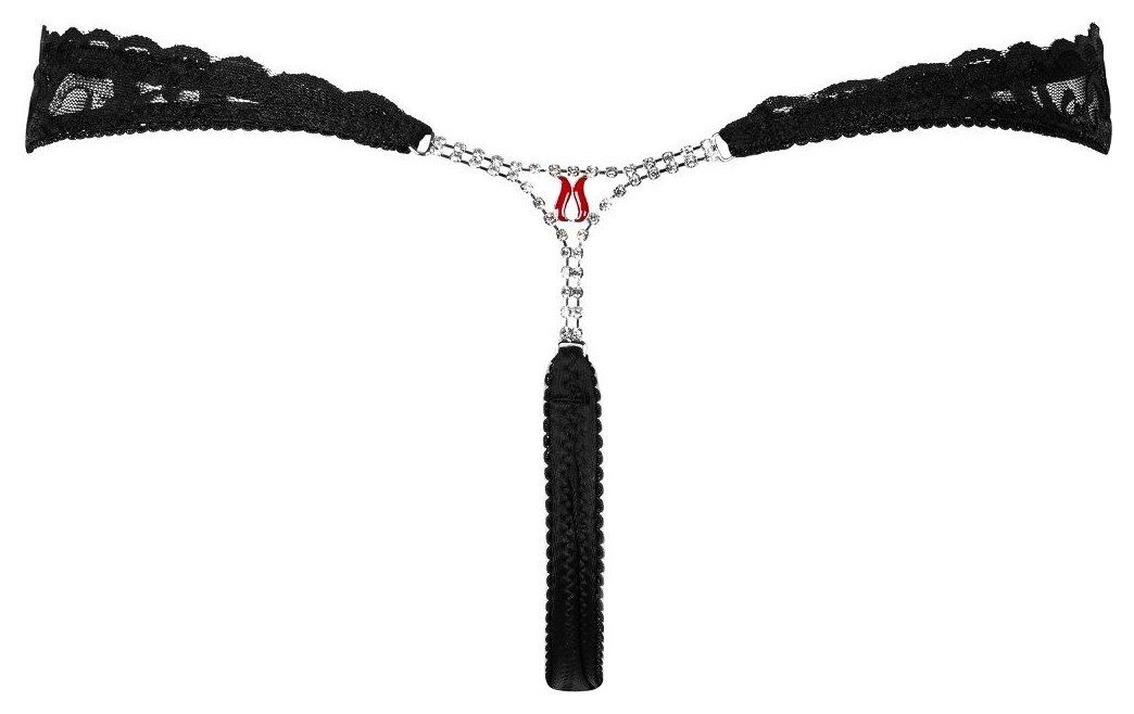 Элегантные стринги, изготовленные из тонкого эластичного кружева с металлическим элементом сзади в виде буквы V с вкраплёнными блестящими камешками и маленьким красным тюльпаном в середине.
