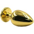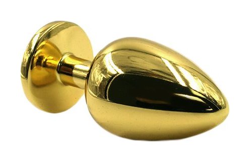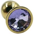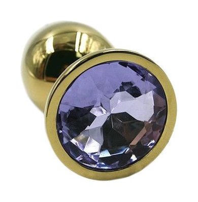 Золотая анальная пробка из алюминия размер S. Страз в основании круглой формы, выполнен из стекла светло-фиолетового цвета. Упакована в вельветовый мешочек для хранения. Вес - 52 гр.