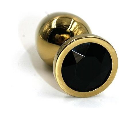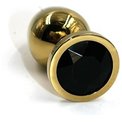 Золотая анальная пробка из алюминия размер S. Страз в основании круглой формы, выполнен из стекла черного цвета. Упакована в вельветовый мешочек для хранения. Вес - 52 гр.