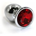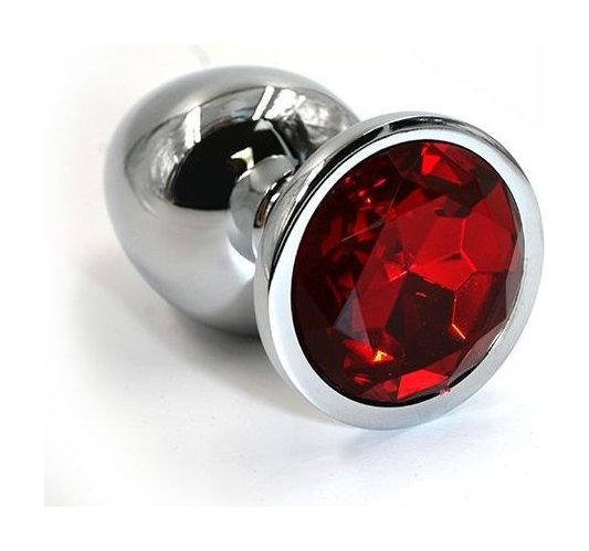 Анальная пробка из алюминия размер M. Страз в основании круглой формы, выполнен из стекла красного цвета. Упакована в вельветовый мешочек для хранения. Вес - 82,5 гр.