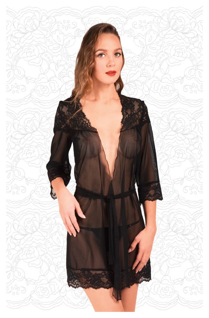 Пеньюар из сетки с кружевной отделкой и поясом.