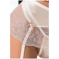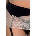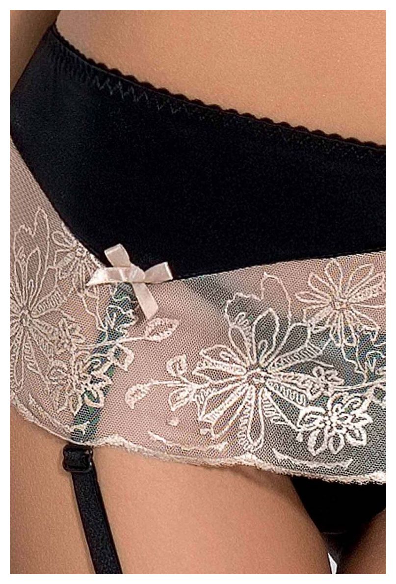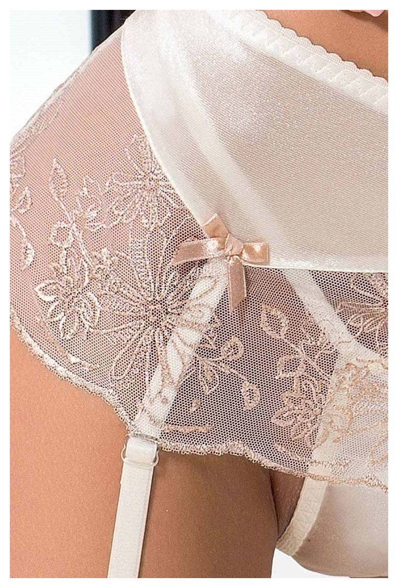 Бюстгальтер, чашка мягкая, на косточке, украшена вышивкой, бретели регулируются по длине, застежка на крючках. Широкий пояс для чулок снизу украшен вышивкой, сзади на атласной шнуровке. Пажи для чулок не отстегиваются, регулируются по длине. Трусики стринги в комплекте. В комплекте: бюстгальтер, трусики-стринги, пояс.