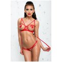 Игривый комплект из топа и оригинальных трусиков прекрасно подойдет смелым модницам. Фантазийное переплетение лент на деталях комплекта вскружит голову даже самым притязательным партнерам. Множество металлических деталей золотистого цвета добавляют гламурного блеска. Пажи для чулок отстегиваются и имеют регуляторы длины, что позволяет использовать этот комплект в различных вариациях. Создай свой кокетливый образ! В комплекте: лиф, трусики-стринги.