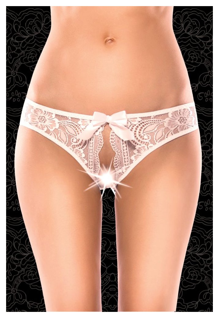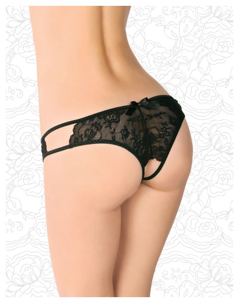 Кокетливые кружевные трусики из ажурного полотна, эротично декорированы маленькими атласными бантиками. Передняя и задняя часть белья соединяется на бёдрах двумя тонкими резинками, оставляя оголенные участки тела. Внизу расположен сексуальный интимный вырез, позволяющий придаваться страсти, не снимая белья.