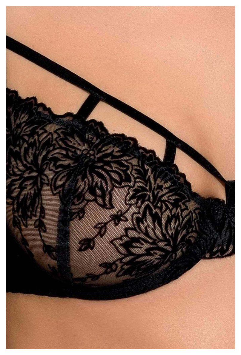 Сексуальный комплект Haya с узором в виде цветов и веточек. В комплекте: бюстгальтер, трусики-стринги, пояс.