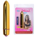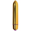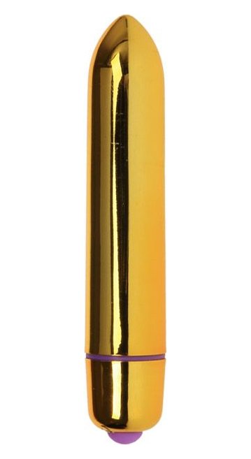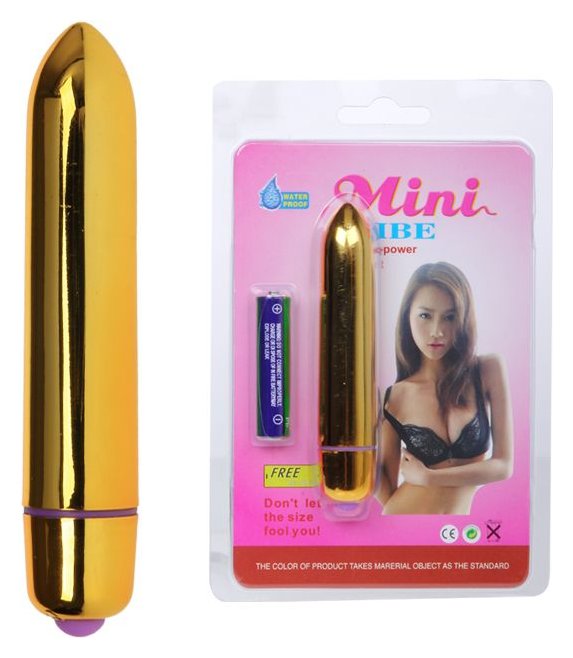 Золотистая водонепроницаемая вибропулька. Кнопка для включения расположена внизу. Суженый кончик.
