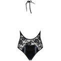 Элегантное кружевное боди, спина полуоткрытая, бретели завязываются вокруг шеи, низ боди на застежке, крючки.