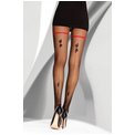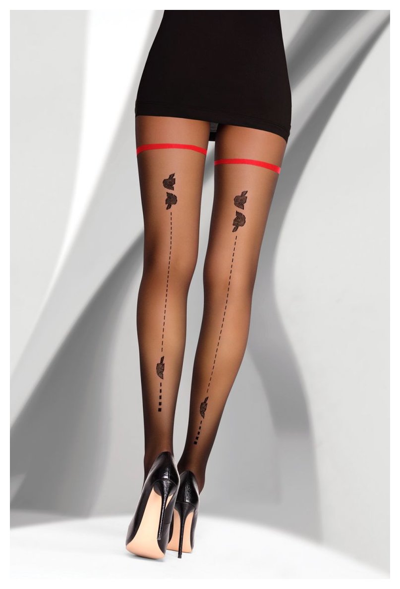 Колготки Marva со стрелкой-пунктиром, узором и красную полосой. Все это зрительно стройнит и удлиняет ножки.