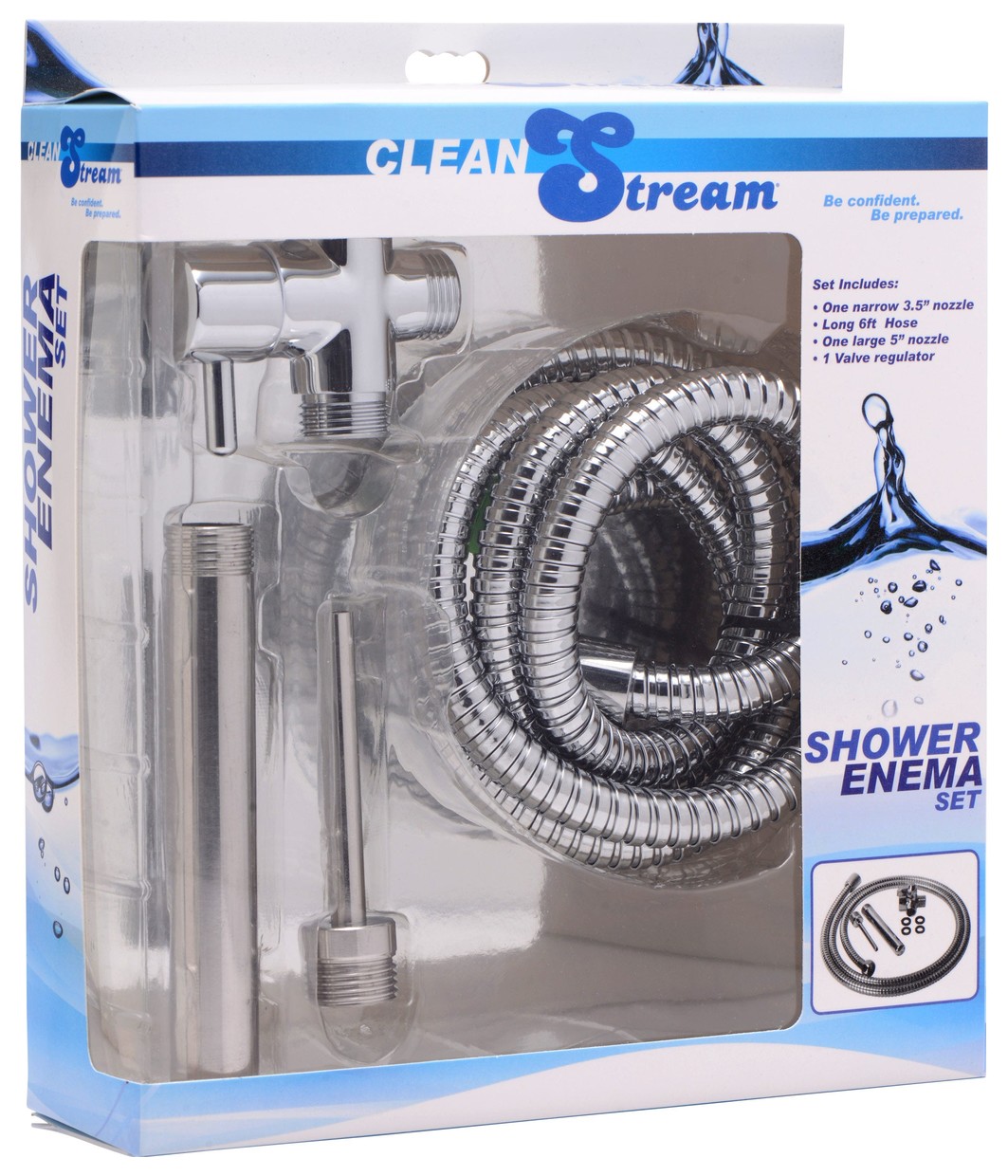 Комплект для анального душа, которым можно пользоваться для гигиенической очистки ануса перед анальным сексом, или в качестве секс-игрушки для медицинского фетиша. Комплект используется как насадка на месте обычного душа. В комплект входит специальный переходник на кран, длинный металлический шланг плюс две насадки. Длина шланга - 183 см. Длина насадок - 12,5 и 9 см.
