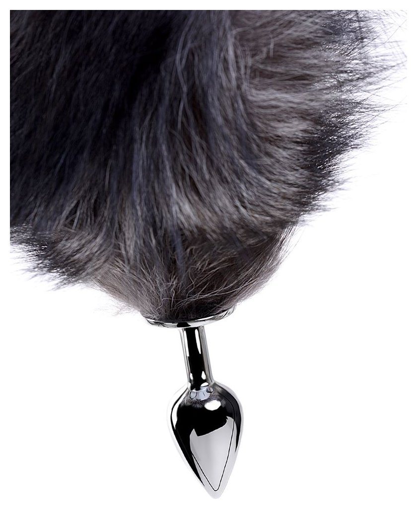 Серебристая металлическая анальная втулка с хвостом-чернобуркой