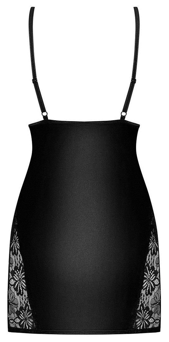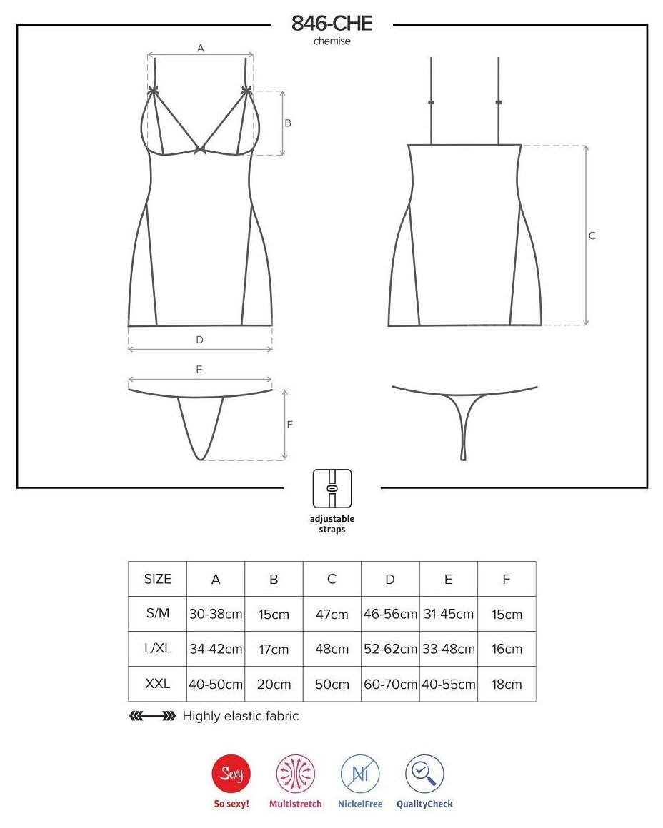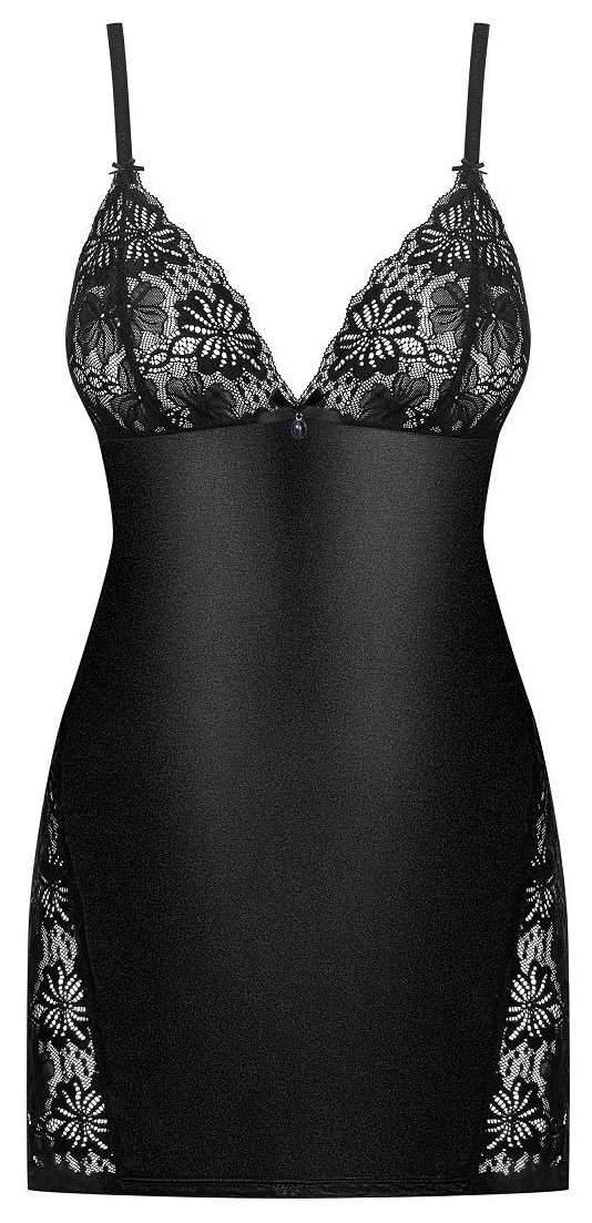 Элегантная сорочка пошита из стрейч-материала с легким атласным блеском, благодаря чему красиво облегает фигуру и подчеркивает формы. Треугольные чашки лифа выполнены из эластичного кружева с цветочным рисунком. По центру декорированы бантиком и подвеской. Сбоку сорочку украшают вставки из такого же нежного, отлично тянущегося ажура. В комплект входят трусики-стринги. В комплекте: сорочка, трусики-стринги.