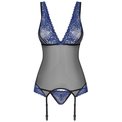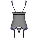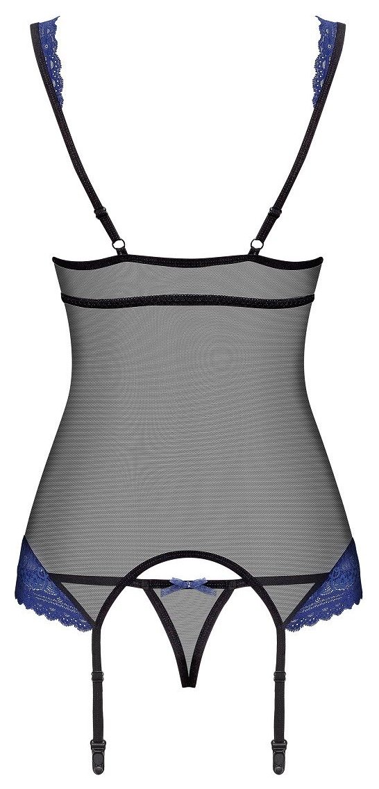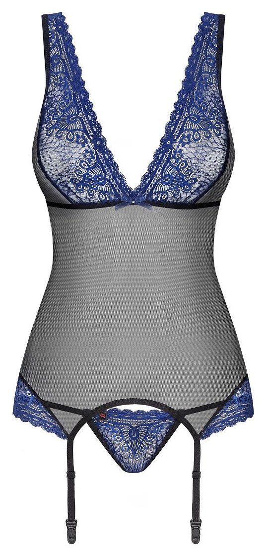 Соблазнительный полупрозрачный корсаж с синим кружевом. В комплекте: корсаж, трусики-стринги.