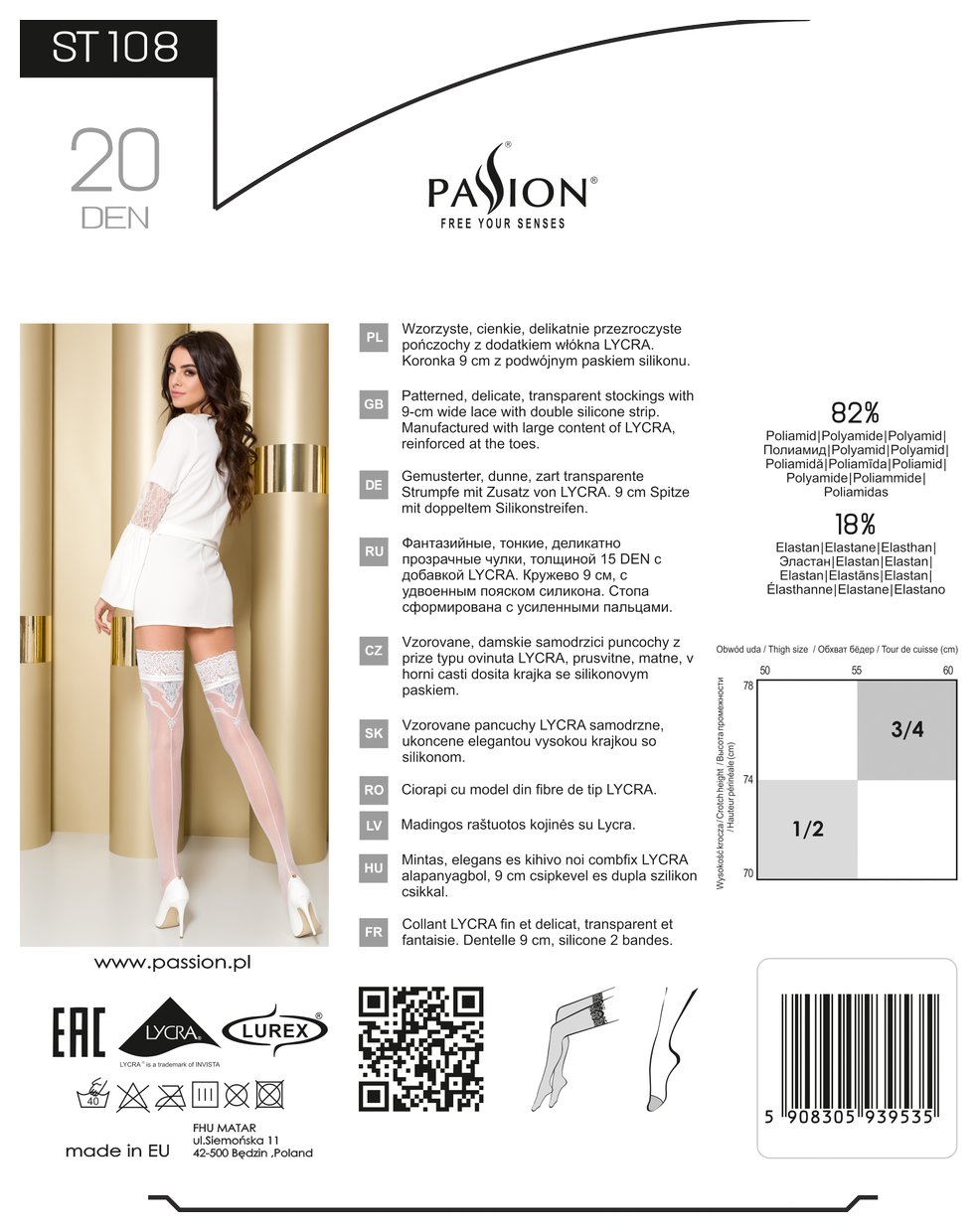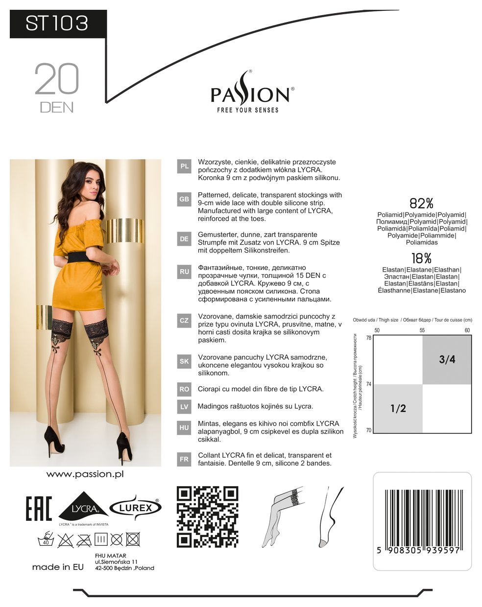 Чулки Passion станут элегантным дополнением к любому наряду, а в нужный момент подчеркнут страстность вашей натуры и помогут вскружить голову вашему кавалеру. Романтичный рисунок на резиночке и откровенные вырезы довершат ваш неповторимый образ. Продукт не вызывает аллергии, не красит, не пускает краску при стирке. Произведено на территории Европейского Союза. Продукт изготовлен из сертифицированных материалов наивысшего европейского качества.
