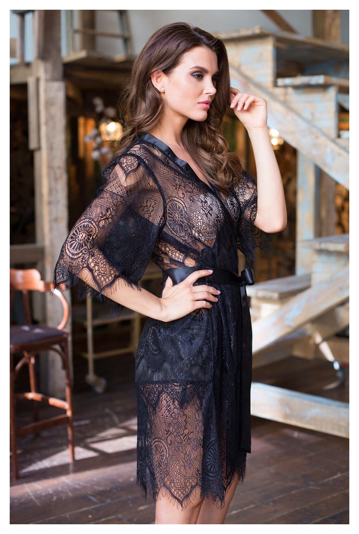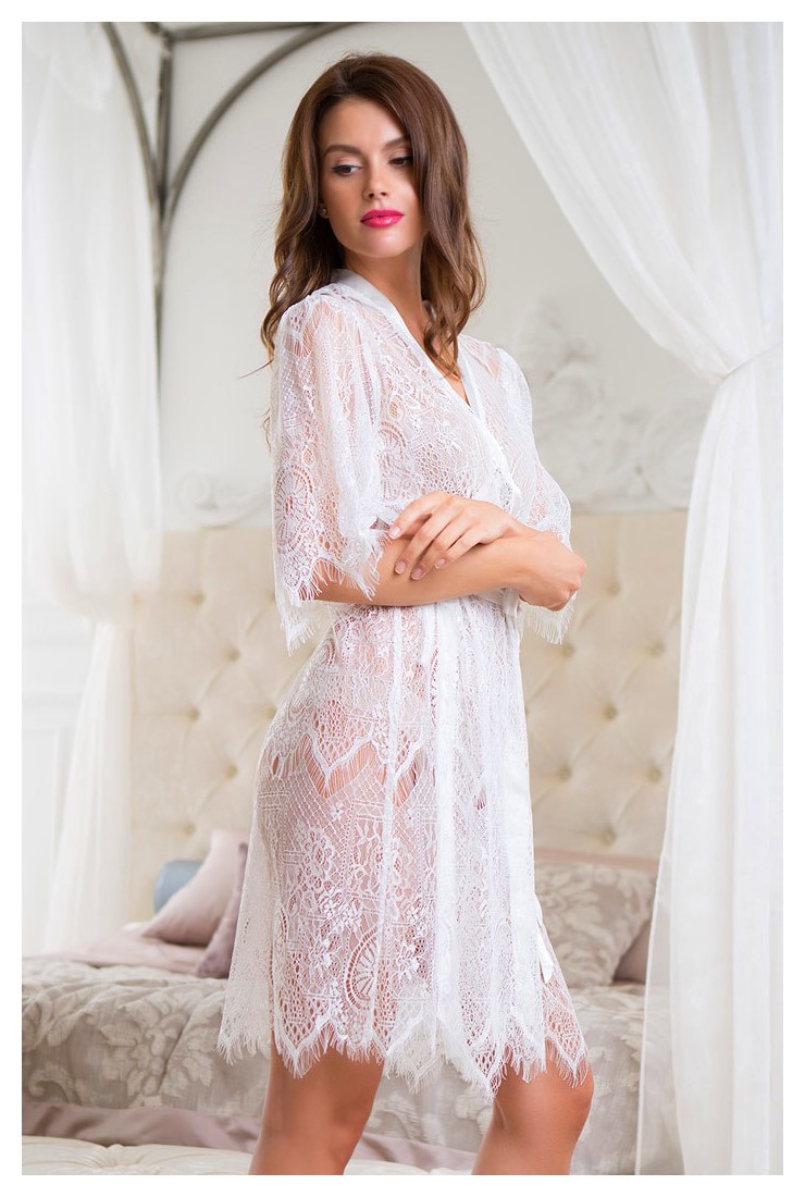 Короткий халат прямого силуэта выполнен из кружева. Халат на поясе из атласа, с втачным рукавом 1/2. По борту и по горловине модель подчеркнута обтачкой из атласа, по талии завязывается на внутреннюю завязку.