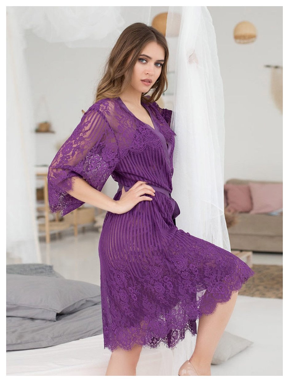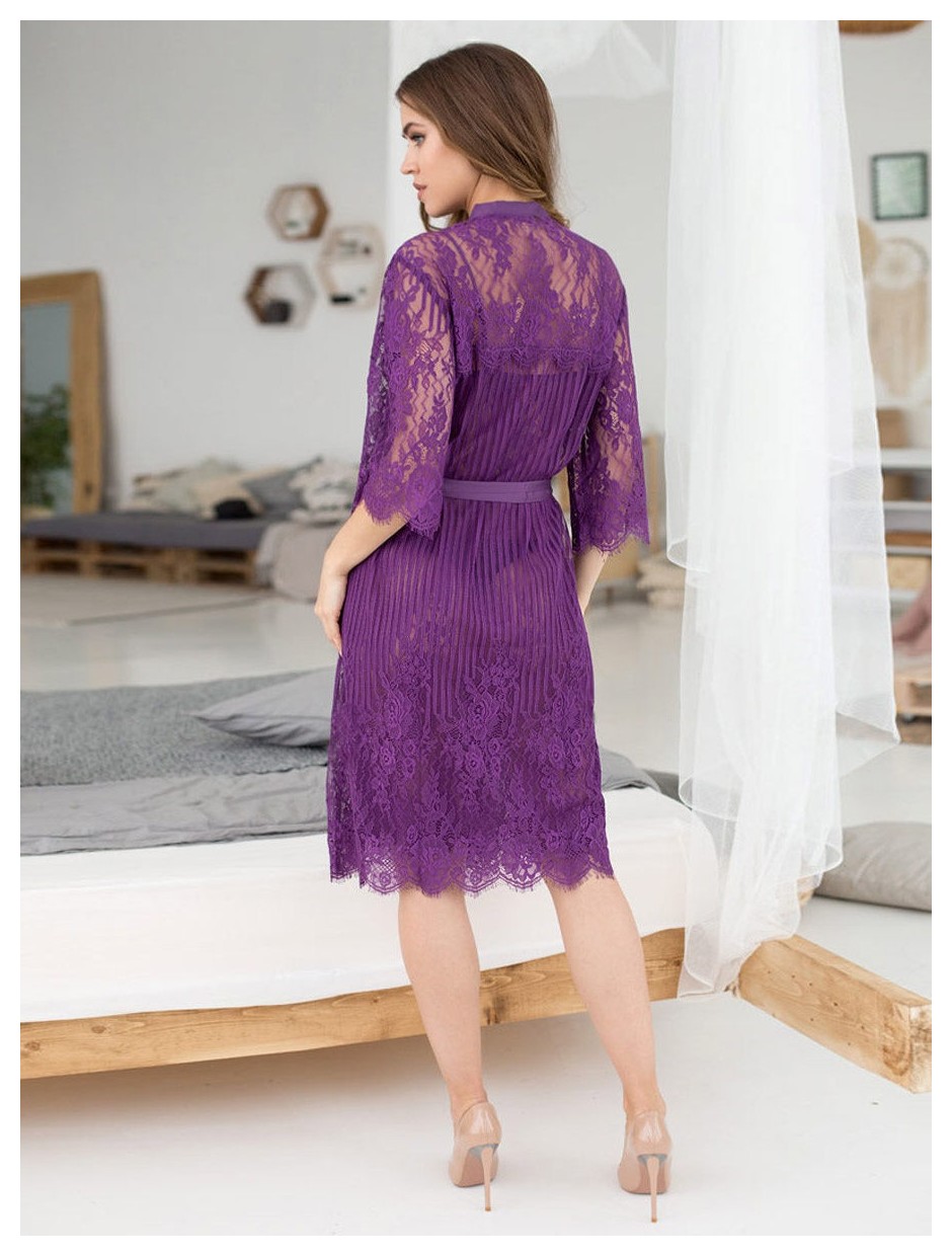 Изящный длинный халат из необычного кружева с втачными опущенными рукавами. Низ рукавов из ажурного кружева. На спинке кружевная кокетка. Халат завязывается на пояс из однотонного атласа и внутреннюю завязку. Нижняя часть халата выполнена из ажурного кружева, что придает модели неповторимый образ.