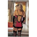 Сорочка с открытой грудью из эластичного трикотажа и кружева. Чашечки на тонком поролоне и косточках. Застежка сзади на крючках. Спинка открытая. Бретельки и подвязки регулируются. В комплекте с трусиками-стринг. Предметов в комплекте: 2 — сорочка, трусики