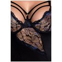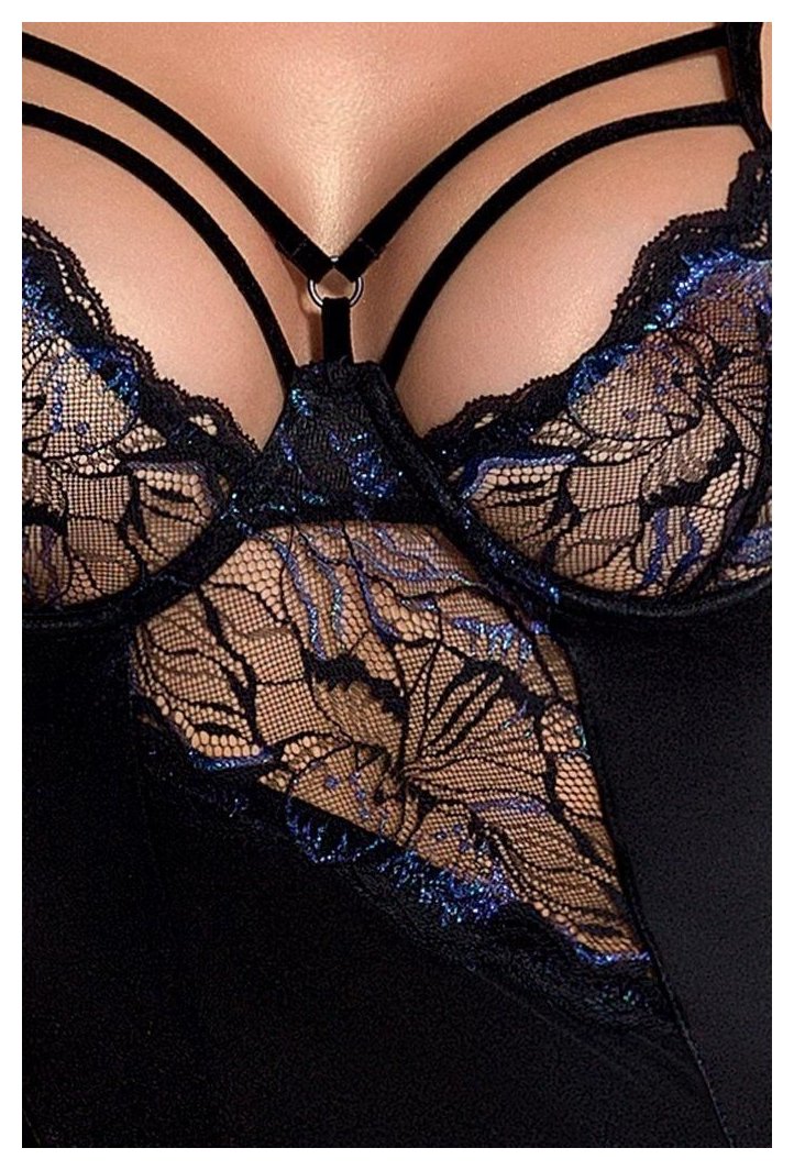 Что отличает Meredith corset на фоне других нарядов? Асимметричные детали, отделанные обычным кружевом и классическим, чёрным тюлем. Целостность выполнена из классического чёрного сатина. Соответствующим образом скроенные материалы и глубокое декольте подчёркивают женские прелести и придают фигуре желаемые стройные формы. Дополнительно ремешки, которые находятся на декольте, в изысканный способ подчёркивают бюст и придают корсету оригинальный характер. В комплекте: корсаж, стринги.