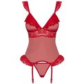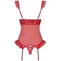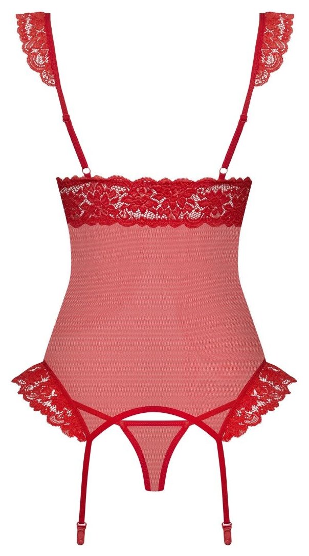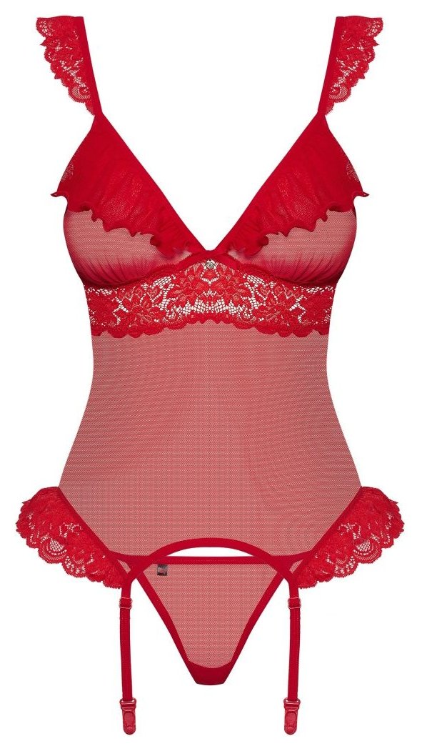 Возбуждающий корсаж с оборками на лифе. В комплекте: корсаж и трусики-стринги.